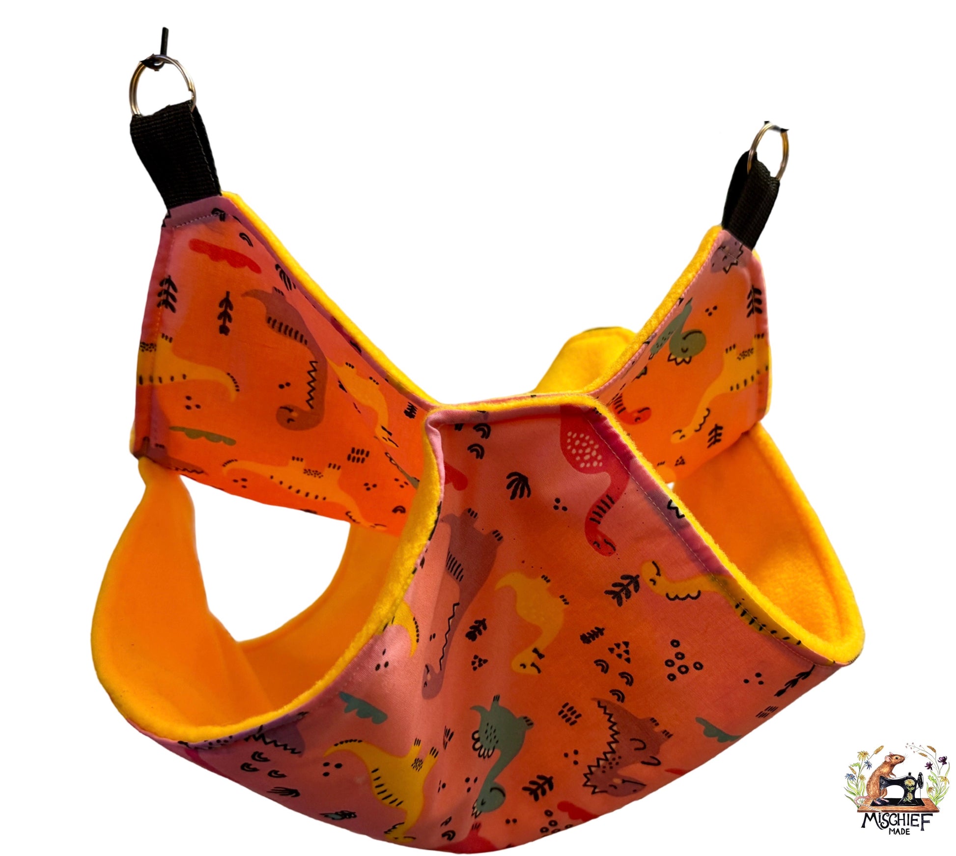 Cosy, supportive and beautifully snug, this Pink Dinosaurs print hammock set with soft yellow fleece is a comfy upgrade for your pet’s cage set-up. Ideal as rat hammocks and a brilliant choice of small pet cage accessories for ferrets, degus and chinchillas too.