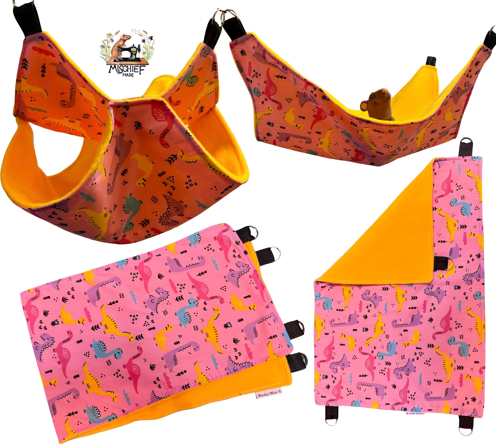 4 piece fleece lined rodent hammock set for rats ferrets chinchillas Pink Dinosaurs
