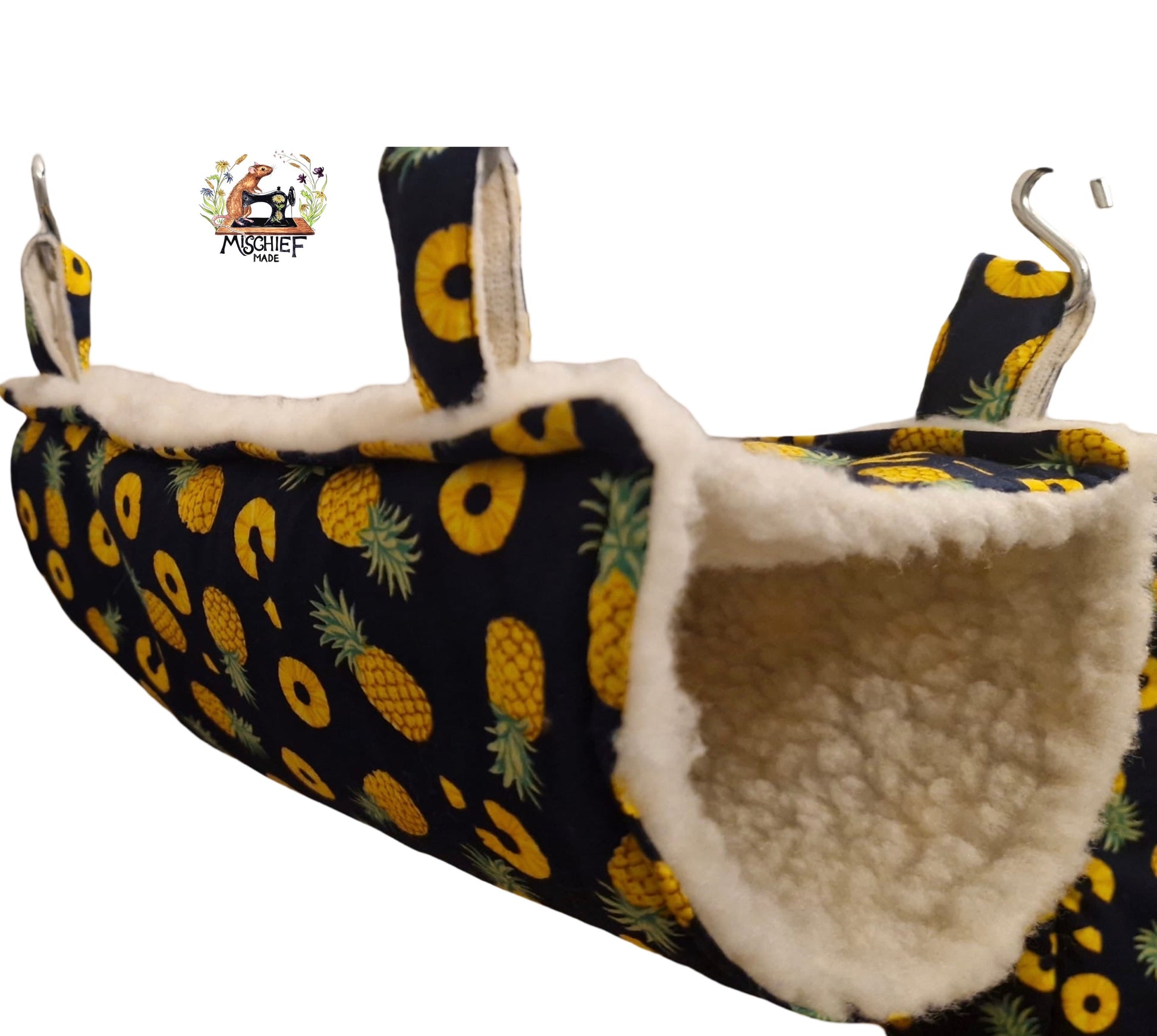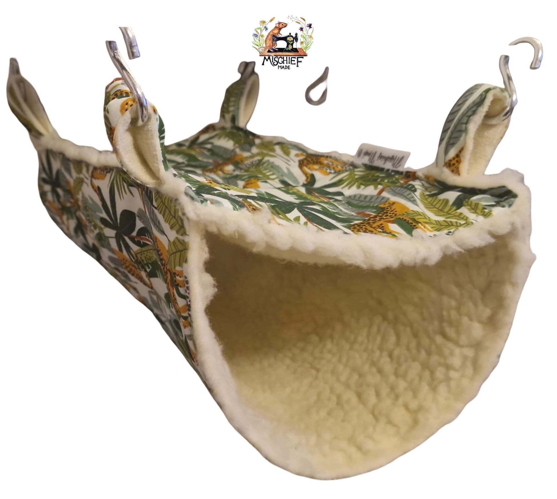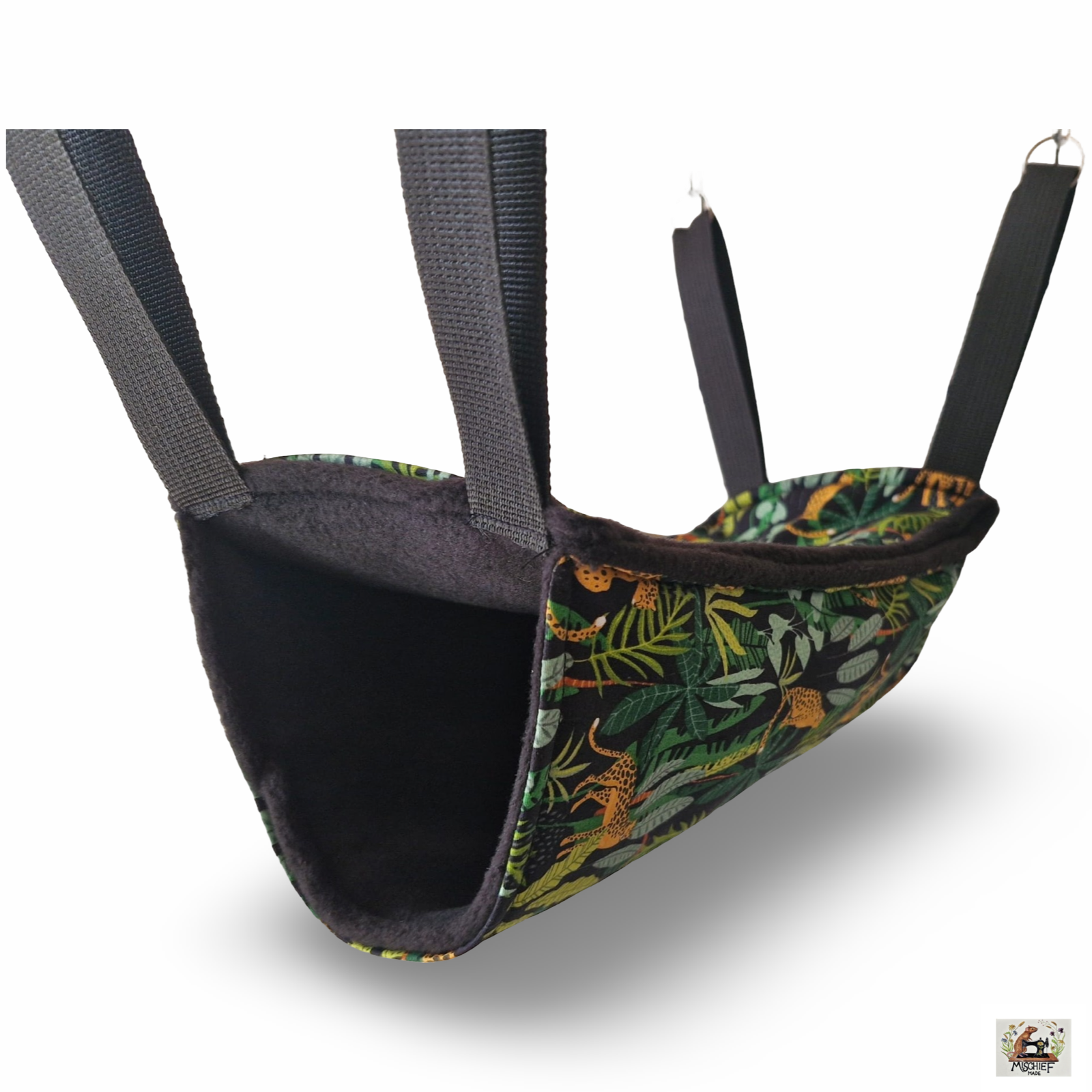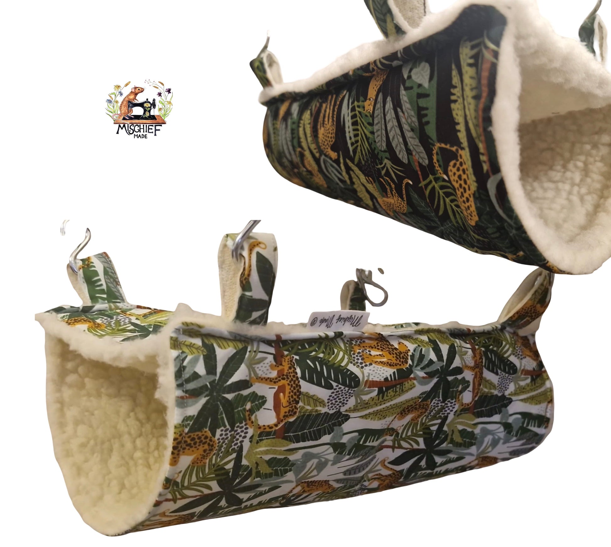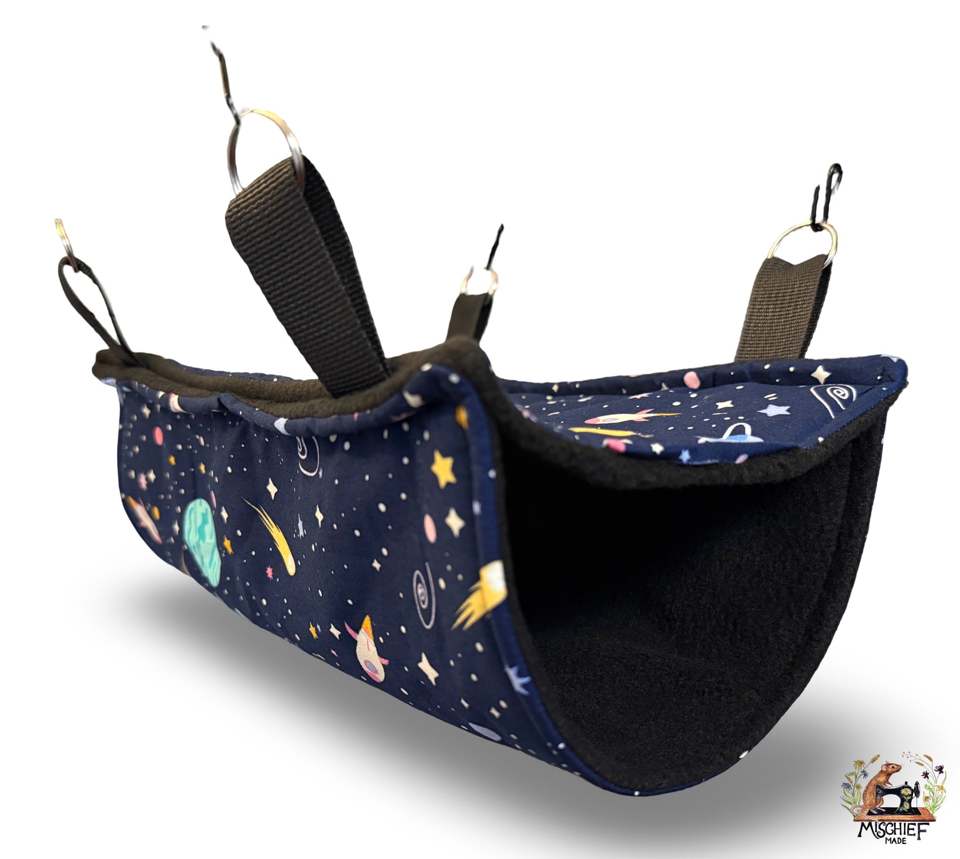 Double lined for warmth and structure, the tube hangs from strong fabric straps and steel rings, creating a gentle sway that many rats find deeply relaxing. Perfect for solo snoozes or shared naps.
