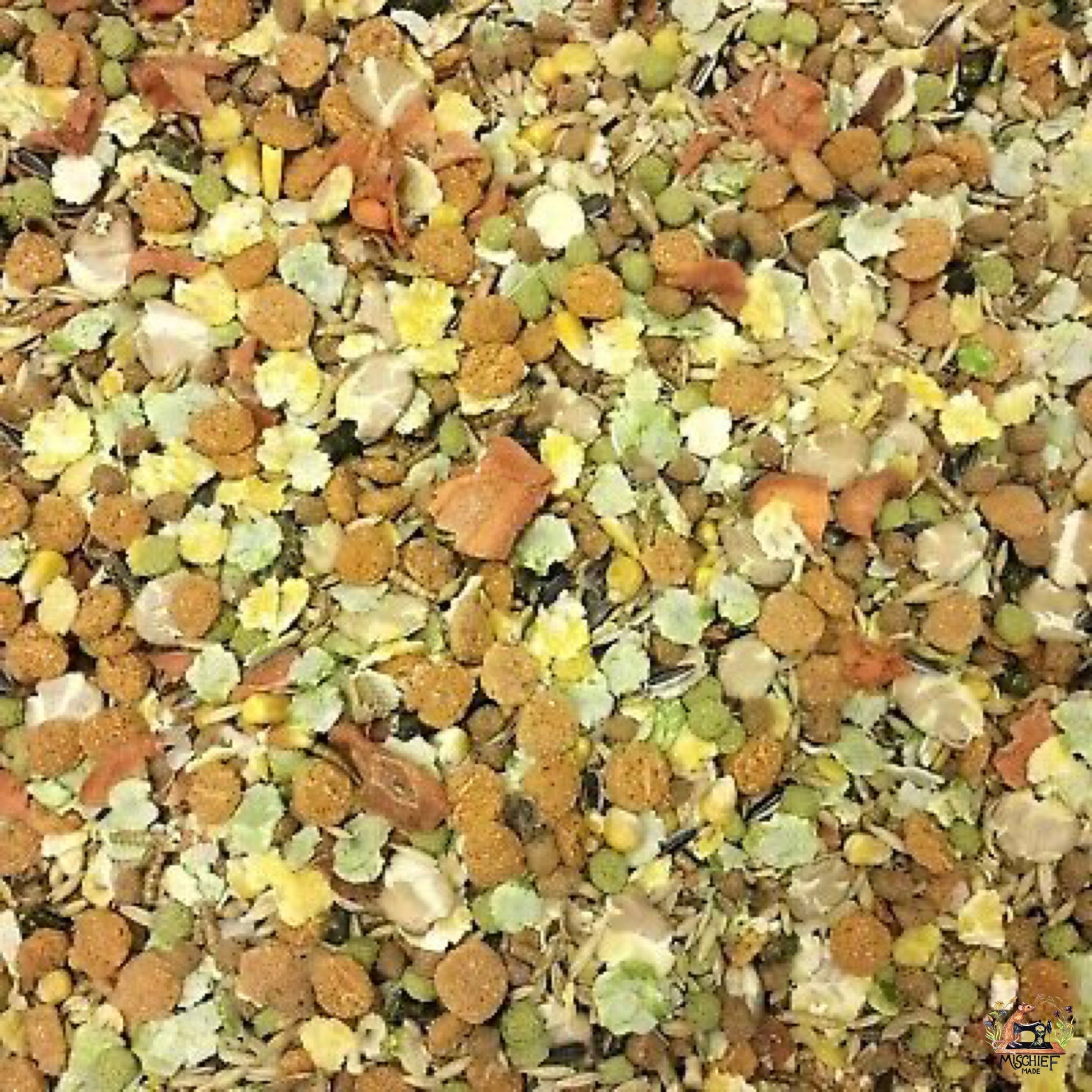 This is a muesli-style base mix. Many keepers combine it with a plainer, more uniform feed (or another base mix) to help reduce selective feeding while keeping meals interesting.